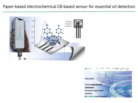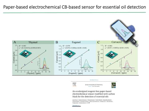A highlight of the presentation was the demonstration of a reagent-free printed electrochemical sensor, modified with carbon black nanomaterial, capable of detecting essential oils across liquid, solid and aerosol samples. By leveraging the intrinsic porosity of paper, the sensor incorporates the necessary reagent and manages microfluidics without external pumps or additional sampling systems – showcasing a powerful example of sustainable sensor engineering.