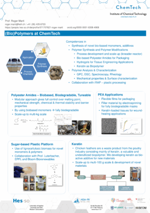 The poster was developed by our partners from the School of Engineering and Architecture of Fribourg (HEIA-FR) Roger Marti, Amira Ben Mansour and Justin Horner, who display their progress on deriving keratin peptides from poultry production waste streams. They will be used as antimicrobial compound modifiers of the surface of the copper doped mesopourous silica nanoparticles (Cu-SMIN).