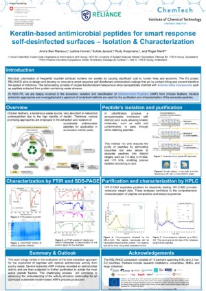 Download the first poster here. The second one is titled “Keratin-based antimicrobial peptides for smart response self-disinfected surfaces – Isolation & Characterization” presents the findings regarding the extraction, isolation, and identification of Antimicrobial Peptides (AMP) from chicken feathers, in which several extraction approaches are particularly investigated and a spectrum of analytical methods are used for the purification and characterization of the extracted peptides. The posters were developed by our partners from HES-SO Haute école spécialisée de Suisse occidentale, Roger Marti, A. Ben Mansour, J. Horner, S. Janson.