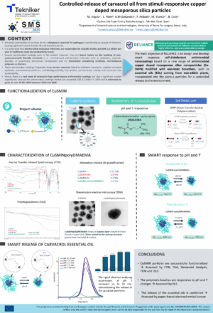 A poster titled “Controlled-release of carvacrol oil from stimuli-responsive copper-doped mesoporous silica particles” showcased RELIANCE results during the joint EU projects workshop "Next-Gen Nanocoatings" held at the Smart Materials and Surfaces Conference in Rome, October 2025. The poster is co-authored by M. Argaiz, A.M. Goitandiaa, M. Blanco and B. Cotoa from Química de Superficies y Nanotecnología, Tekniker, Eibar, Spain, and L. Fiore and F. Arduini from Department of Chemical Science and Technologies, University of Rome Tor Vergata, Rome, Italy.